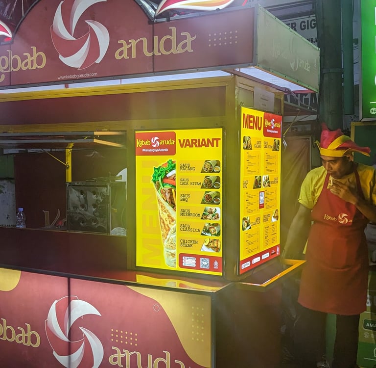 Kunjungi Kebab Garuda untuk menikmati kebab timur tengah yang dipadukan dengan rempah dan budaya kuliner Indonesia yang kaya.